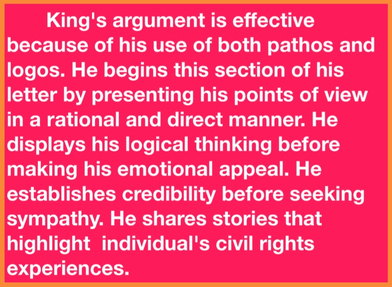King's argument is effective because of his use of both pathos and logos. He begins this section of his letter by presenting his points of view in a rational and direct manner. He displays his logical thinking before making his emotional appeal. He establishes credibility before seeking sympathy. He shares stories that highlight individual's civil rights experiences.