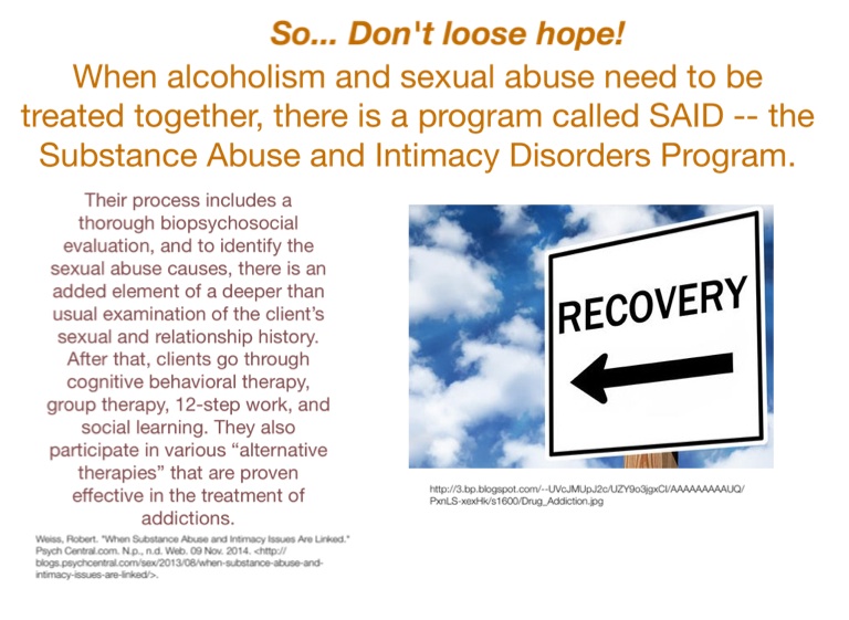 When alcoholism and sexual abuse need to be treated together, there is a program called SAID -- the Substance Abuse and Intimacy Disorders Program.