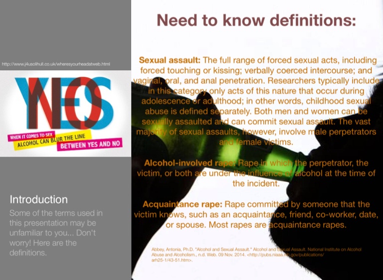 Abbey, Antonia, Ph.D. "Alcohol and Sexual Assault." Alcohol and Sexual Assault. National Institute on Alcohol Abuse and Alcoholism., n.d. Web. 09 Nov. 2014. <http://pubs.niaaa.nih.gov/publications/arh25-1/43-51.htm>.