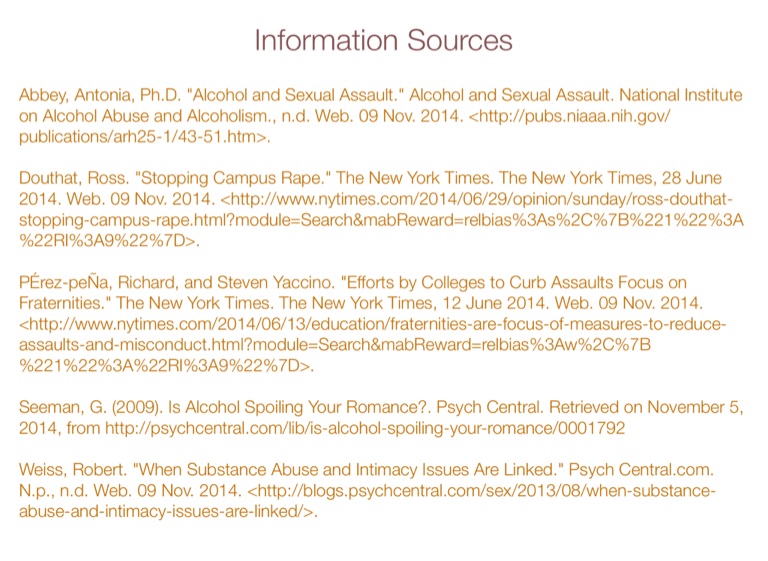 Abbey, Antonia, Ph.D. "Alcohol and Sexual Assault." Alcohol and Sexual Assault. National Institute on Alcohol Abuse and Alcoholism., n.d. Web. 09 Nov. 2014. <http://pubs.niaaa.nih.gov/publications/arh25-1/43-51.htm>.