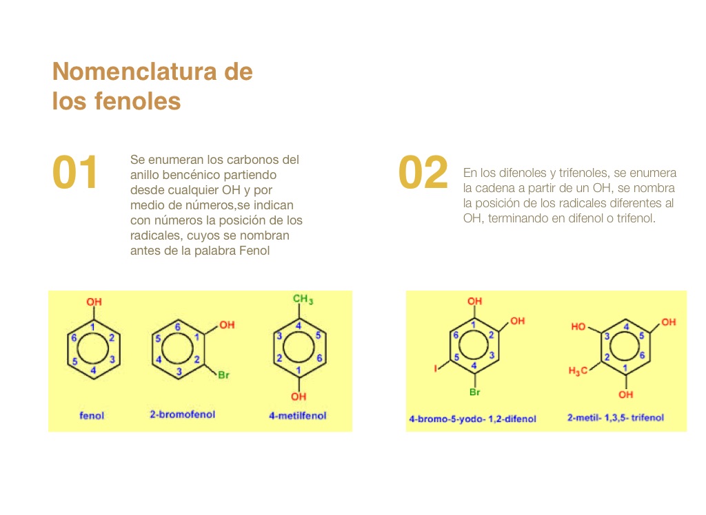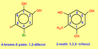 En los difenoles y trifenoles, se enumera la cadena a partir de un OH, se nombra la posición de los radicales diferentes al OH, terminando en difenol o trifenol.
