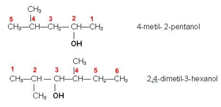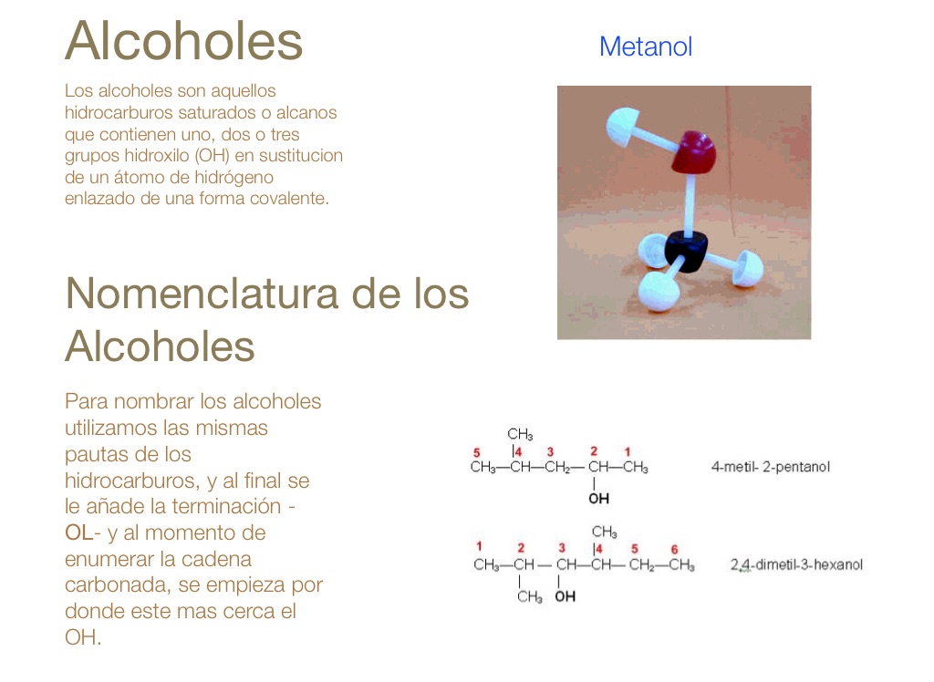 Para nombrar los alcoholes utilizamos las mismas pautas de los hidrocarburos, y al final se le añade la terminación -OL- y al momento de enumerar la cadena carbonada, se empieza por donde este mas cerca el OH.