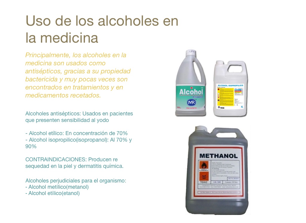Principalmente, los alcoholes en la medicina son usados como antisépticos, gracias a su propiedad bactericida y muy pocas veces son encontrados en tratamientos y en medicamentos recetados.
