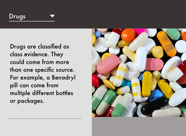 Drugs are classified as class evidence. They could come from more than one specific source. For example, a Benadryl pill can come from multiple different bottles or packages.