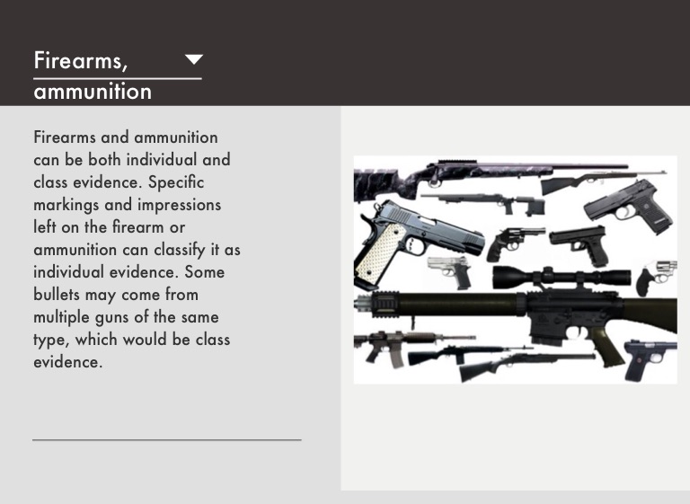 Firearms and ammunition can be both individual and class evidence. Specific markings and impressions left on the firearm or ammunition can classify it as individual evidence. Some bullets may come from multiple guns of the same type, which would be class evidence.