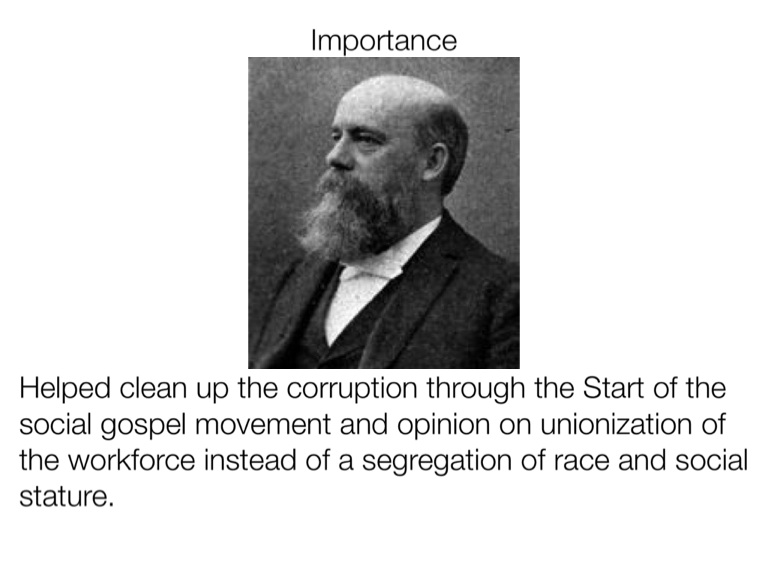 Helped clean up the corruption through the Start of the social gospel movement and opinion on unionization of the workforce instead of a segregation of race and social stature.