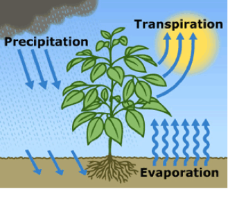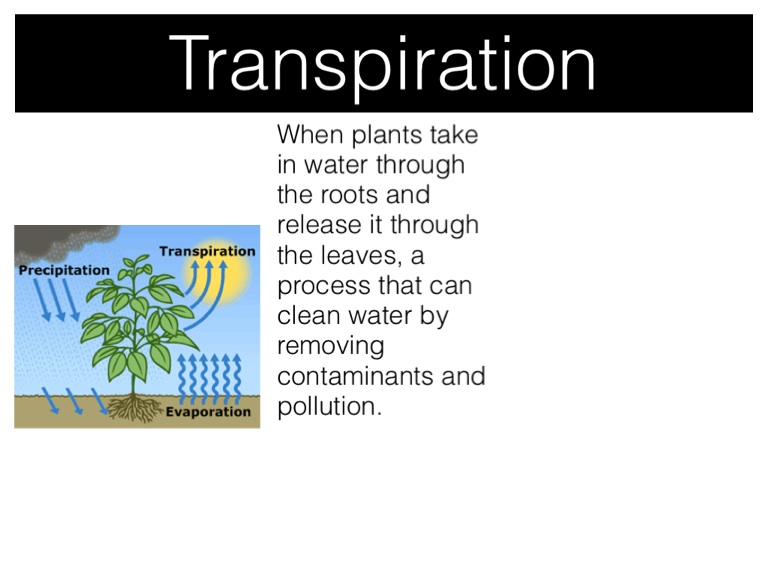 When plants take in water through the roots and release it through the leaves, a process that can clean water by removing contaminants and pollution.