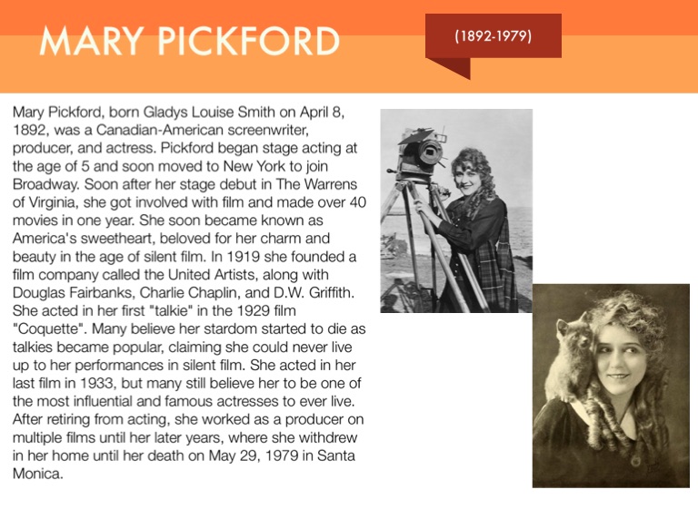 Mary Pickford, born Gladys Louise Smith on April 8, 1892, was a Canadian-American screenwriter, producer, and actress. Pickford began stage acting at the age of 5 and soon moved to New York to join Broadway. Soon after her stage debut in The Warrens of Virginia, she got involved with film and made over 40 movies in one year. She soon became known as America's sweetheart, beloved for her charm and beauty in the age of silent film. In 1919 she founded a film company called the United Artists, along with Douglas Fairbanks, Charlie Chaplin, and D.W. Griffith. She acted in her first "talkie" in the 1929 film "Coquette". Many believe her stardom started to die as talkies became popular, claiming she could never live up to her performances in silent film. She acted in her last film in 1933, but many still believe her to be one of the most influential and famous actresses to ever live. After retiring from acting, she worked as a producer on multiple films until her later years, where she withdrew in her home until her death on May 29, 1979 in Santa Monica.