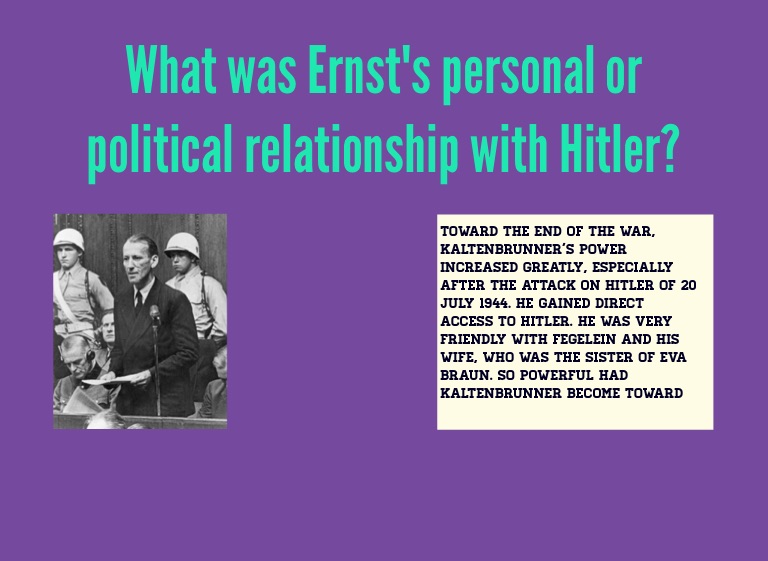 Toward the end of the war, Kaltenbrunner's power increased greatly, especially after the attack on Hitler of 20 July 1944. He gained direct access to Hitler. He was very friendly with Fegelein and his wife, who was the sister of Eva Braun. So powerful had Kaltenbrunner become toward the end that even Heinrich Himmler feared him.
