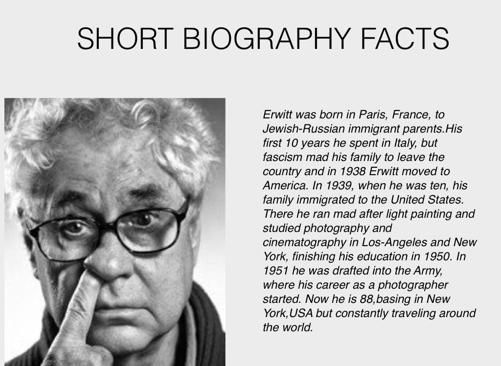 Erwitt was born in Paris, France, to Jewish-Russian immigrant parents.His first 10 years he spent in Italy, but fascism mad his family to leave the country and in 1938 Erwitt moved to America. In 1939, when he was ten, his family immigrated to the United States. There he ran mad after light painting and studied photography and cinematography in Los-Angeles and New York, finishing his education in 1950. In 1951 he was drafted into the Army, where his career as a photographer started. Now he is 88,basing in New York,USA but constantly traveling around the world.
