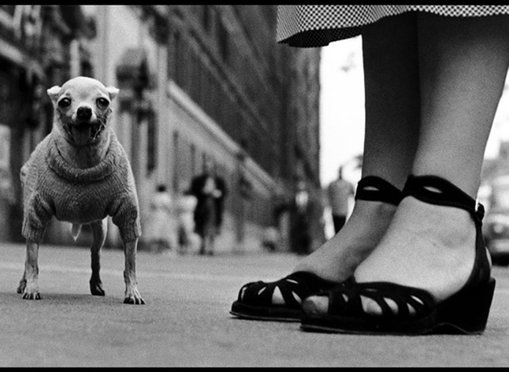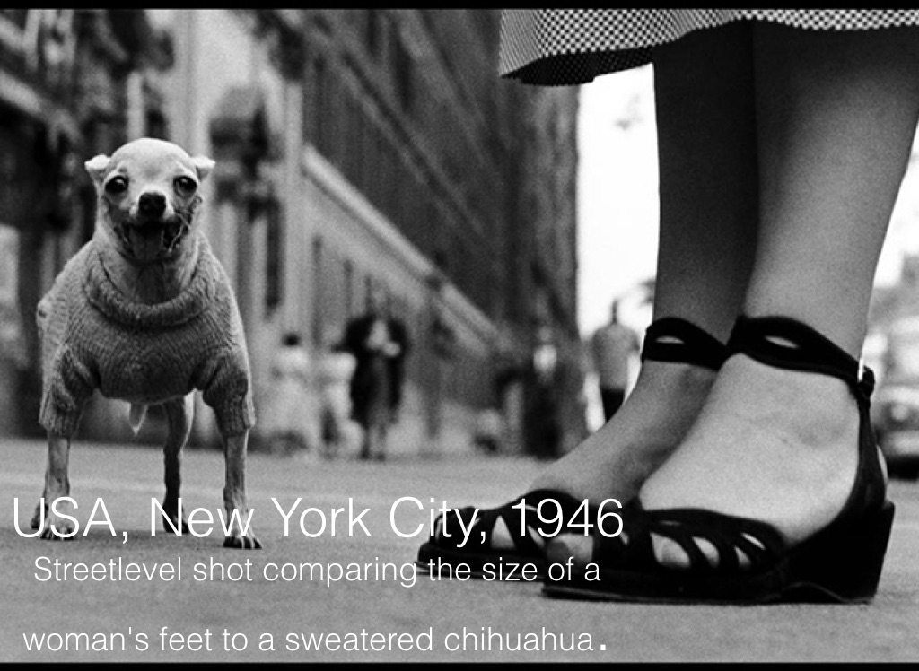 USA, New York City, 1946 Streetlevel shot comparing the size of a woman's feet to a sweatered chihuahua.
