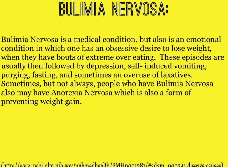 Bulimia Nervosa is a medical condition, but also is an emotional condition in which one has an obsessive desire to lose weight, when they have bouts of extreme over eating. These episodes are usually then followed by depression, self- induced vomiting, purging, fasting, and sometimes an overuse of laxatives. Sometimes, but not always, people who have Bulimia Nervosa also may have Anorexia Nervosa which is also a form of preventing weight gain.