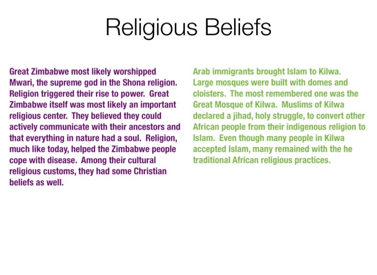 Great Zimbabwe most likely worshipped Mwari, the supreme god in the Shona religion. Religion triggered their rise to power. Great Zimbabwe itself was most likely an important religious center. They believed they could actively communicate with their ancestors and that everything in nature had a soul. Religion, much like today, helped the Zimbabwe people cope with disease. Among their cultural religious customs, they had some Christian beliefs as well.