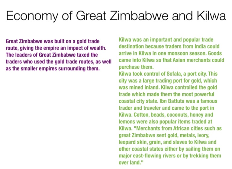 Kilwa was an important and popular trade destination because traders from India could arrive in Kilwa in one monsoon season. Goods came into Kilwa so that Asian merchants could purchase them.