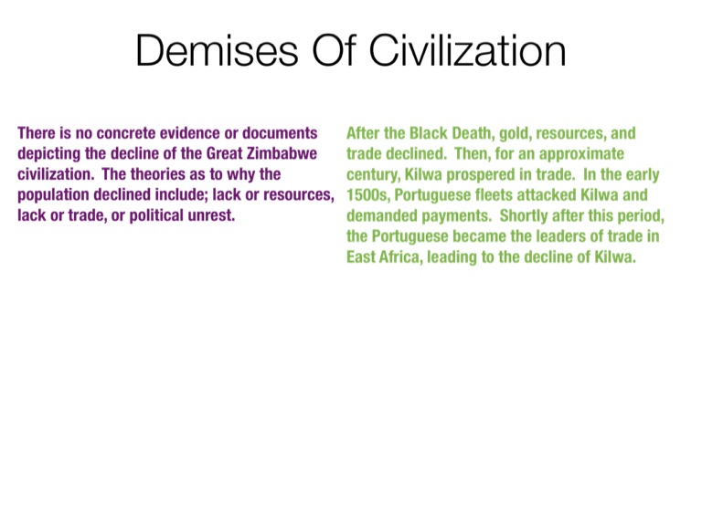 There is no concrete evidence or documents depicting the decline of the Great Zimbabwe civilization. The theories as to why the population declined include; lack or resources, lack or trade, or political unrest.
