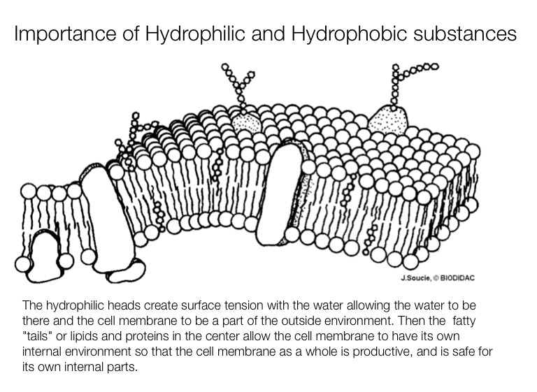 The hydrophilic heads create surface tension with the water allowing the water to be there and the cell membrane to be a part of the outside environment. Then the fatty "tails" or lipids and proteins in the center allow the cell membrane to have its own internal environment so that the cell membrane as a whole is productive, and is safe for its own internal parts.