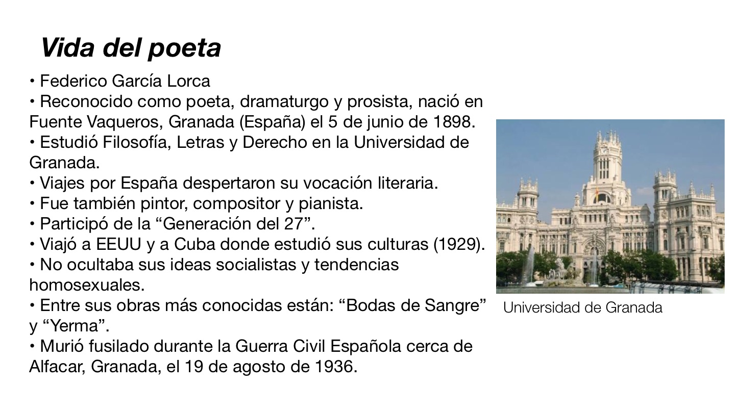 • Reconocido como poeta, dramaturgo y prosista, nació en Fuente Vaqueros, Granada (España) el 5 de junio de 1898.