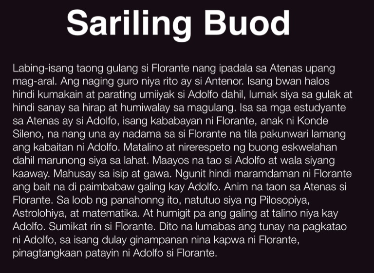 Labing-isang taong gulang si Florante nang ipadala sa Atenas upang mag-aral. Ang naging guro niya rito ay si Antenor. Isang bwan halos hindi kumakain at parating umiiyak si Adolfo dahil, lumak siya sa gulak at hindi sanay sa hirap at humiwalay sa magulang. Isa sa mga estudyante sa Atenas ay si Adolfo, isang kababayan ni Florante, anak ni Konde Sileno, na nang una ay nadama sa si Florante na tila pakunwari lamang ang kabaitan ni Adolfo. Matalino at nirerespeto ng buong eskwelahan dahil marunong siya sa lahat. Maayos na tao si Adolfo at wala siyang kaaway. Mahusay sa isip at gawa. Ngunit hindi maramdaman ni Florante ang bait na di paimbabaw galing kay Adolfo. Anim na taon sa Atenas si Florante. Sa loob ng panahonng ito, natutuo siya ng Pilosopiya, Astrolohiya, at matematika. At humigit pa ang galing at talino niya kay Adolfo. Sumikat rin si Florante. Dito na lumabas ang tunay na pagkatao ni Adolfo, sa isang dulay ginampanan nina kapwa ni Florante, pinagtangkaan patayin ni Adolfo si Florante.