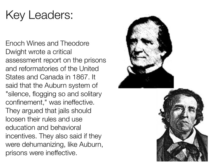 Enoch Wines and Theodore Dwight wrote a critical assessment report on the prisons and reformatories of the United States and Canada in 1867. It said that the Auburn system of "silence, flogging so and solitary confinement," was ineffective. They argued that jails should loosen their rules and use education and behavioral incentives. They also said if they were dehumanizing, like Auburn, prisons were ineffective.