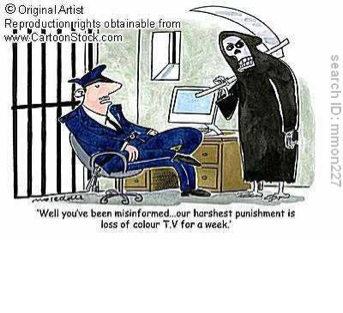This cartoon shows the gradual change of prison reform. Instead of being in conditions that could potentially cause one to lose their life, now the harshest punishment is loss of an unneeded necessity. It also could be viewed as a mockery of the prison system.