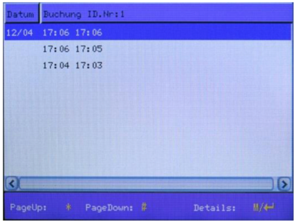 Durch Drücken der Menü-Taste innerhalb von vier Sekunden nach dem Buchungsvorgang, werden alle im Speicher befindlichen Buchungen angezeigt.