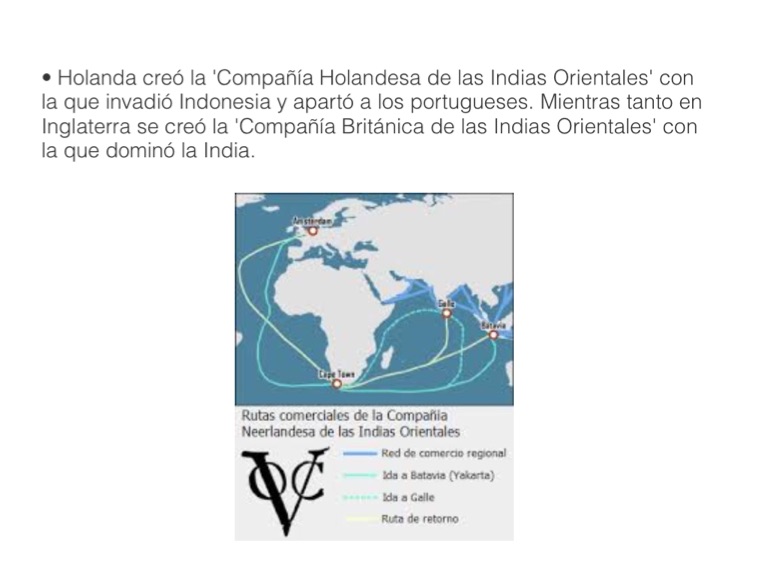 • Holanda creó la 'Compañía Holandesa de las Indias Orientales' con la que invadió Indonesia y apartó a los portugueses. Mientras tanto en Inglaterra se creó la 'Compañía Británica de las Indias Orientales' con la que dominó la India.