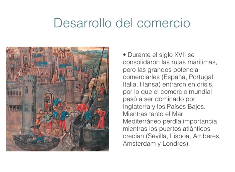 • Durante el siglo XVII se consolidaron las rutas marítimas, pero las grandes potencia comerciarles (España, Portugal, Italia, Hansa) entraron en crisis, por lo que el comercio mundial pasó a ser dominado por Inglaterra y los Países Bajos. Mientras tanto el Mar Mediterráneo perdía importancia mientras los puertos atlánticos crecían (Sevilla, Lisboa, Amberes, Amsterdam y Londres).
