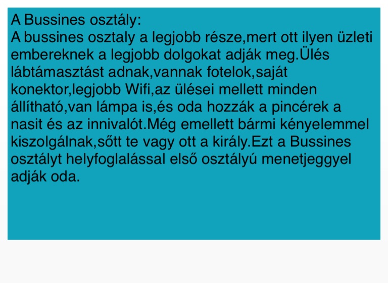 A bussines osztaly a legjobb része,mert ott ilyen üzleti embereknek a legjobb dolgokat adják meg.Ülés lábtámasztást adnak,vannak fotelok,saját konektor,legjobb Wifi,az ülései mellett minden állítható,van lámpa is,és oda hozzák a pincérek a nasit és az innivalót.Még emellett bármi kényelemmel kiszolgálnak,sőtt te vagy ott a király.Ezt a Bussines osztályt helyfoglalással első osztályú menetjeggyel adják oda.