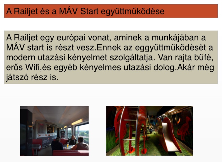 A Railjet egy európai vonat, aminek a munkájában a MÁV start is részt vesz.Ennek az eggyüttműködèsèt a modern utazási kényelmet szolgáltatja. Van rajta büfé, erős Wifi,és egyéb kényelmes utazási dolog.Akár még játszó rész is.