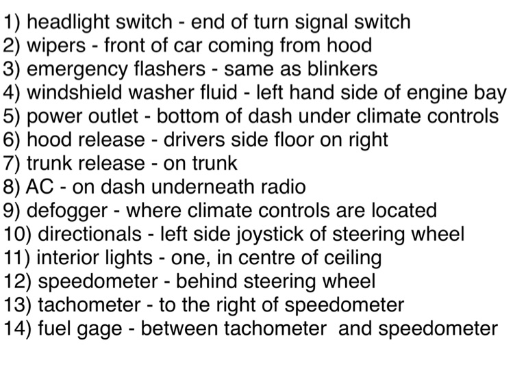 6) hood release - drivers side floor on right