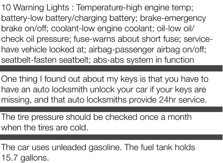 The car uses unleaded gasoline. The fuel tank holds 15.7 gallons.