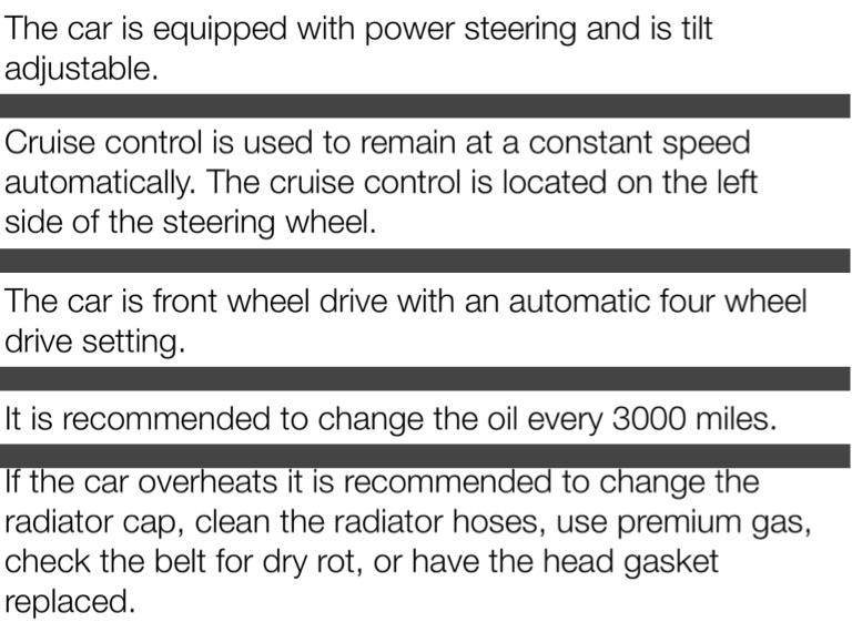 If the car overheats it is recommended to change the radiator cap, clean the radiator hoses, use premium gas, check the belt for dry rot, or have the head gasket replaced.