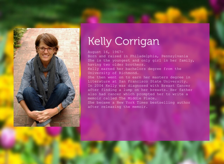 In 2004 Kelly was diagnosed with Breast Cancer after finding a lump on her breasts. Her father also had cancer which prompted her to write a memoir called The Middle Place.