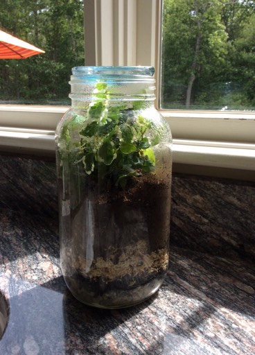 The sun shines in the window creating heat in the wet soil causing it to evaporate.