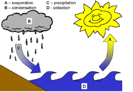 When heat causes water to warm up it begins to evaporate (A) forming clouds in the form of condensation (B) which then falls back to earth in the form of precipitation (C) which collects (D) into puddles, rivers, streams, and oceans which will then be heated up to evaporate again. This cycle happens over and over again...it is the Water Cycle!!!