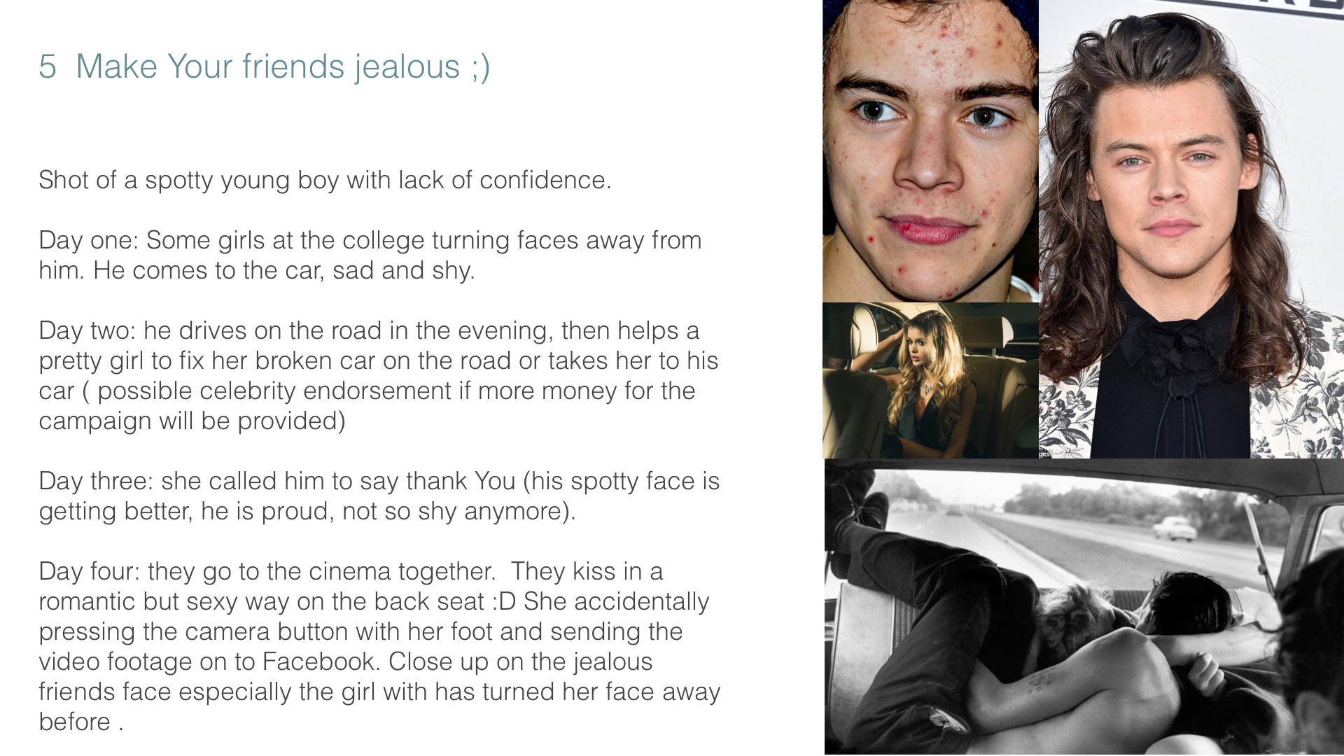 Day four: they go to the cinema together. They kiss in a romantic but sexy way on the back seat :D She accidentally pressing the camera button with her foot and sending the video footage on to Facebook. Close up on the jealous friends face especially the girl with has turned her face away before .