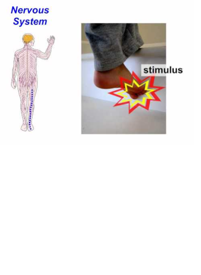 When a human responds to a stimuli ( when you touch a hot stove with your finger) your nervous system sends a message to your brain telling you to pull your arm away from the hot surface. Your muscle system will contract or harden.