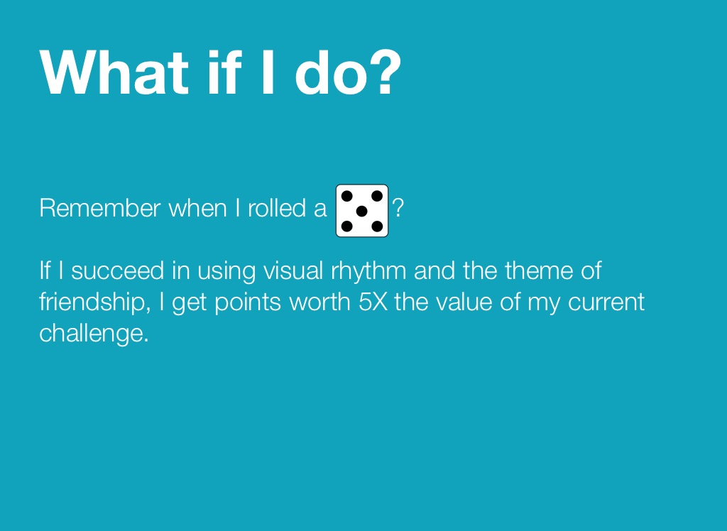 If I succeed in using visual rhythm and the theme of friendship, I get points worth 5X the value of my current challenge.