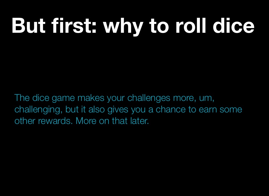 The dice game makes your challenges more, um, challenging, but it also gives you a chance to earn some other rewards. More on that later.