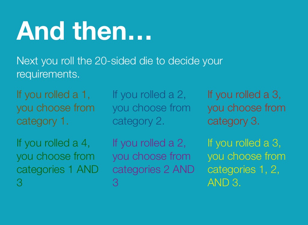 Next you roll the 20-sided die to decide your requirements.