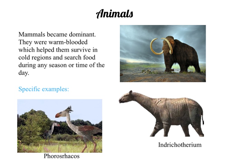Mammals became dominant. They were warm-blooded which helped them survive in cold regions and search food during any season or time of the day.