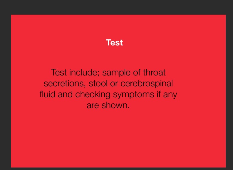 Test include; sample of throat secretions, stool or cerebrospinal fluid and checking symptoms if any are shown.