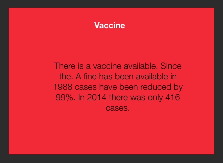 There is a vaccine available. Since the. A fine has been available in 1988 cases have been reduced by 99%. In 2014 there was only 416 cases.
