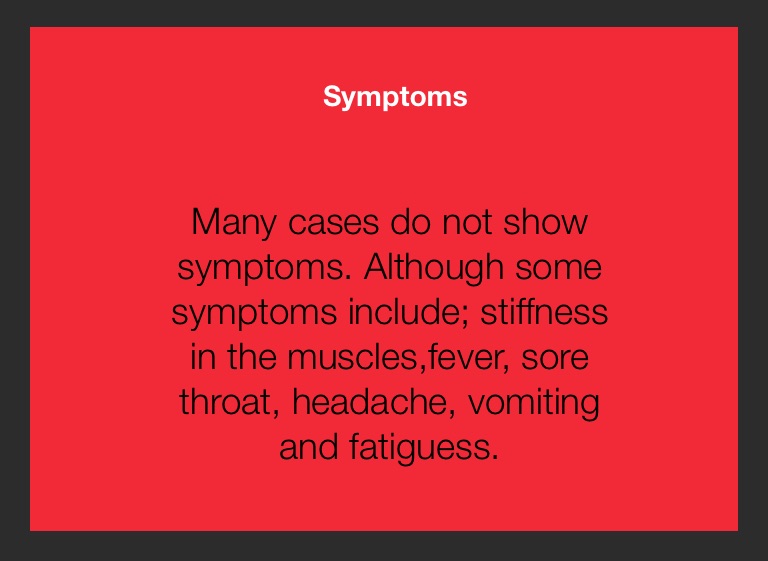 Many cases do not show symptoms. Although some symptoms include; stiffness in the muscles,fever, sore throat, headache, vomiting and fatiguess.