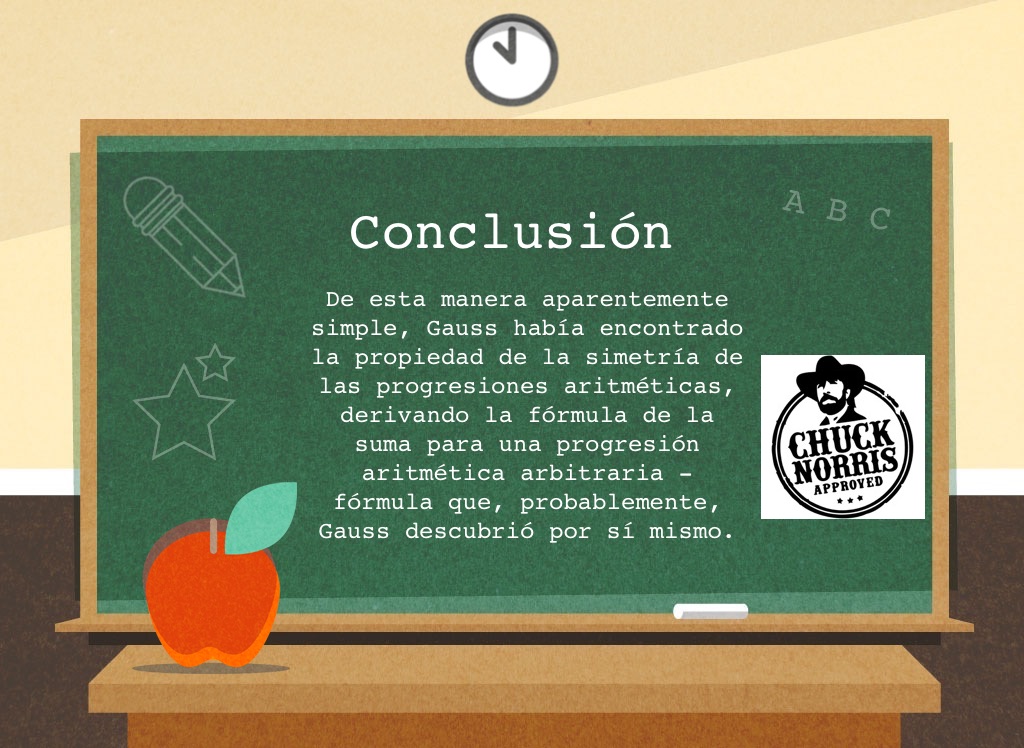 De esta manera aparentemente simple, Gauss había encontrado la propiedad de la simetría de las progresiones aritméticas, derivando la fórmula de la suma para una progresión aritmética arbitraria - fórmula que, probablemente, Gauss descubrió por sí mismo.