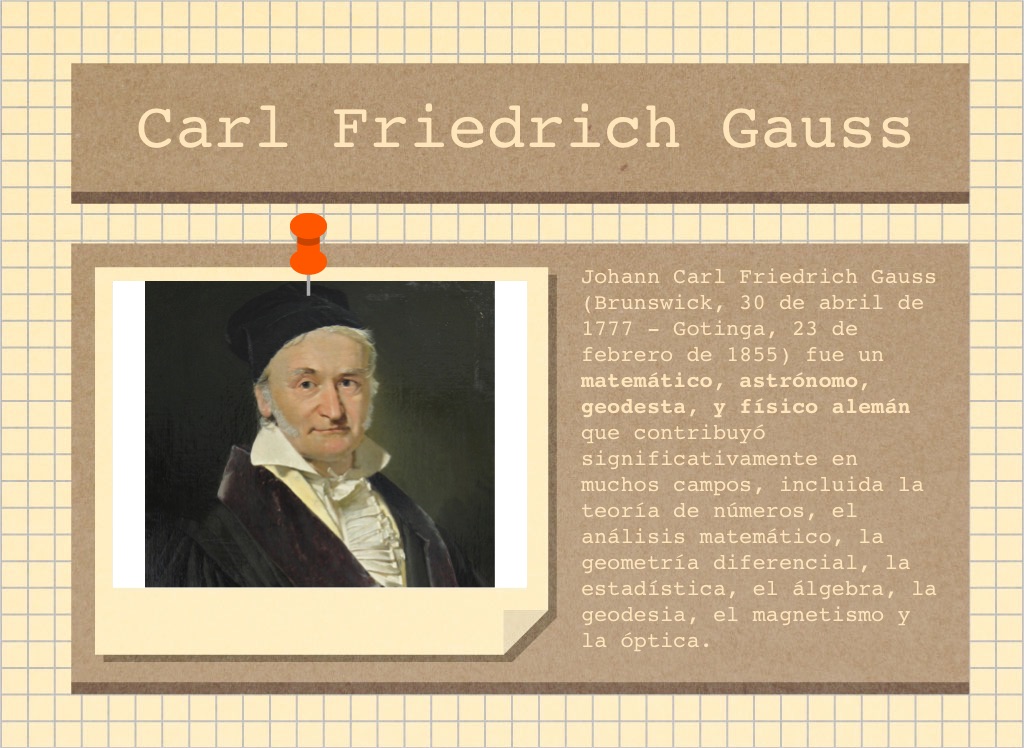 Johann Carl Friedrich Gauss (Brunswick, 30 de abril de 1777 - Gotinga, 23 de febrero de 1855) fue un matemático, astrónomo, geodesta, y físico alemán que contribuyó significativamente en muchos campos, incluida la teoría de números, el análisis matemático, la geometría diferencial, la estadística, el álgebra, la geodesia, el magnetismo y la óptica.