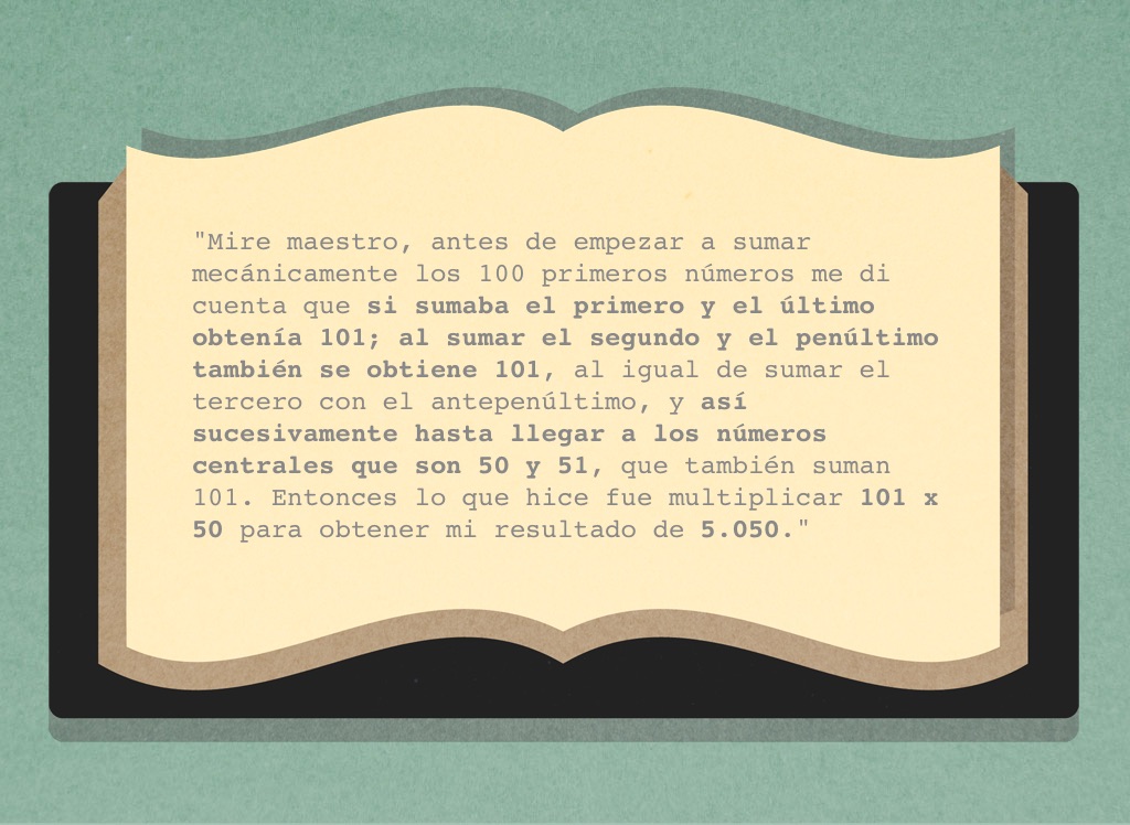 "Mire maestro, antes de empezar a sumar mecánicamente los 100 primeros números me di cuenta que si sumaba el primero y el último obtenía 101; al sumar el segundo y el penúltimo también se obtiene 101, al igual de sumar el tercero con el antepenúltimo, y así sucesivamente hasta llegar a los números centrales que son 50 y 51, que también suman 101. Entonces lo que hice fue multiplicar 101 x 50 para obtener mi resultado de 5.050."