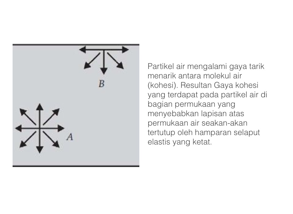 Partikel air mengalami gaya tarik menarik antara molekul air (kohesi). Resultan Gaya kohesi yang terdapat pada partikel air di bagian permukaan yang menyebabkan lapisan atas permukaan air seakan-akan tertutup oleh hamparan selaput elastis yang ketat.