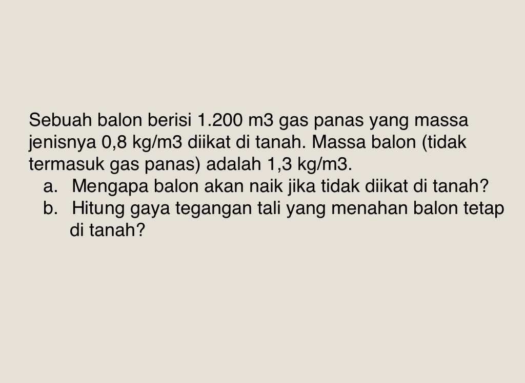 Sebuah balon berisi 1.200 m3 gas panas yang massa jenisnya 0,8 kg/m3 diikat di tanah. Massa balon (tidak termasuk gas panas) adalah 1,3 kg/m3.