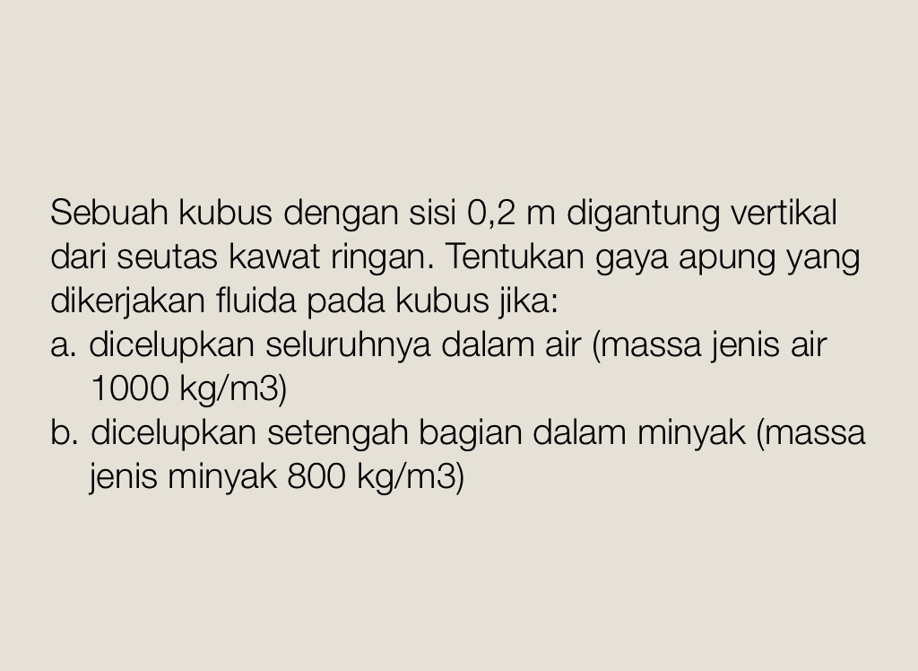 Sebuah kubus dengan sisi 0,2 m digantung vertikal dari seutas kawat ringan. Tentukan gaya apung yang dikerjakan fluida pada kubus jika: